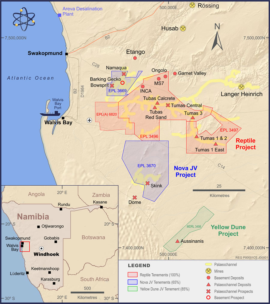 The joint venture is applying innovative geophysical and geochemical exploration methods and systematic drilling to the discovery of buried mineralisation. Previously unknown, but sub-economic, mineralisation has been so far been discovered at the Namaqua palaeochannel and Iguana basement deposits. The Iguana deposit is of a type that is dissimilar to the Rössing and Husab basement deposits, as uranium is concentrated in unusual black quartz veins.